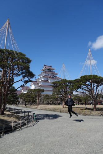 Die Burg Tsuruga – auch bekannt als Burg Aizu Wakamatsu – war die erste Station auf unserer Reise und einfach per Loop Bus vom Bahnhof aus zu erreichen. Ein 20 Minuten Marsch hätte es auch getan. Die Burg selbst, anmutend in seiner Pracht und von Falken umkreist, ist heute ein Museum, umgeben von Parkanlagen und den historischen Rinkaku Teegärten. Dort kann selbstverständlich eine Tasse Tee im traditionellen Teeritual genossen werde.