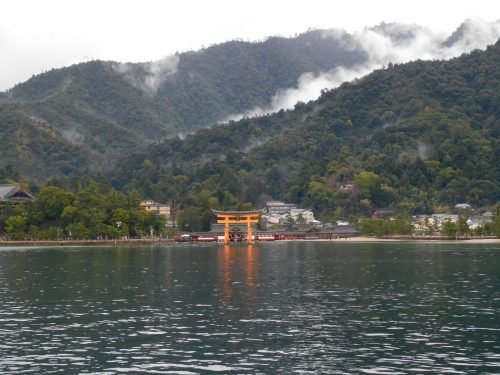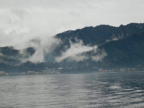 Ich selber nutze die Chance, während wir über das Seto-Binnenmeer fahren und genieße den Ausblick auf das Gebirge von Miyajima, von wo die Nebelschwaden aus aufsteigen und der Insel einen mystischen Anblick verleihen. Das Wetter ist nicht das Beste an diesem Tag, aber der Schönheit Miyajimas tut das nichts zur Sache.