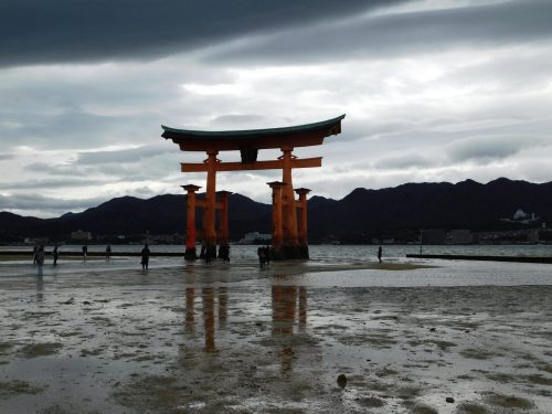 Noch von der Fähre aus konnte ich erkennen, wie das Wasser das bekannte rote Torii-Tor des Itsukushima-Schreins umspült, aber als ich vom Hotel zurück komme, hat sich das Wasser schon so weit zurück gezogen, dass ich ohne Probleme zu dem Torii-Tor laufen kann.