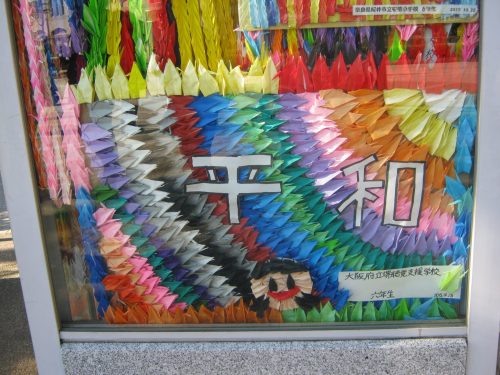 Eine ehrfürchtige Stille hat sich unter den Besuchern ausgebreitet, während wir an den Schaukästen vorbeilaufen und uns die vielen kleinen und großen Kunstwerke anschauen. Es sind wahre Gemälde, die die Kinder mit den Kranichen dargestellt haben, die manchmal auch die Schriftzeichen für Frieden und Verbundenheit zeigen.