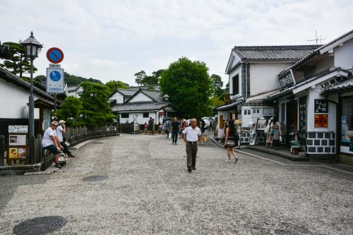 Kurashiki war eine Stadt der Kaufleute unter direkter Kontrolle der Shogun-Regierung in der Edo-Zeit (ca. 1603-1868). Die Stadt florierte mit dem Reishandel und war auch dank Textilien erfolgreich. Entlang des Kanals sind Lagerhallen mit weißen Wänden und schwarzen Kacheln und auf beiden Seiten des Kanals schmückt Trauerweide die Kanalwände. Heutzutage wurden diese Lagerhäuser und Kaufhäuser in Museen, Kunstgalerien oder hübschen Cafés verwandelt. Die Architektur dieses Viertels ist ziemlich homogen. Es gibt auch westlich geprägte Gebäude, die während der Meiji-Zeit erbaut wurden, wie das Ohara Museum oder das Tourismusbüro.