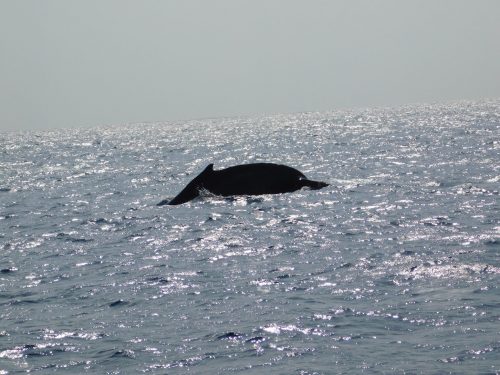„Drei Uhr!“ – Das Boot setzte sich augenblicklich in Bewegung, wir halten uns an der Reling fest und da sehen wir auch schon die 3 bis 5 Meter hohe Nebelfontäne, entstehend durch das Ausatmen, die uns die Anwesenheit eines Buckelwals bestätigt.