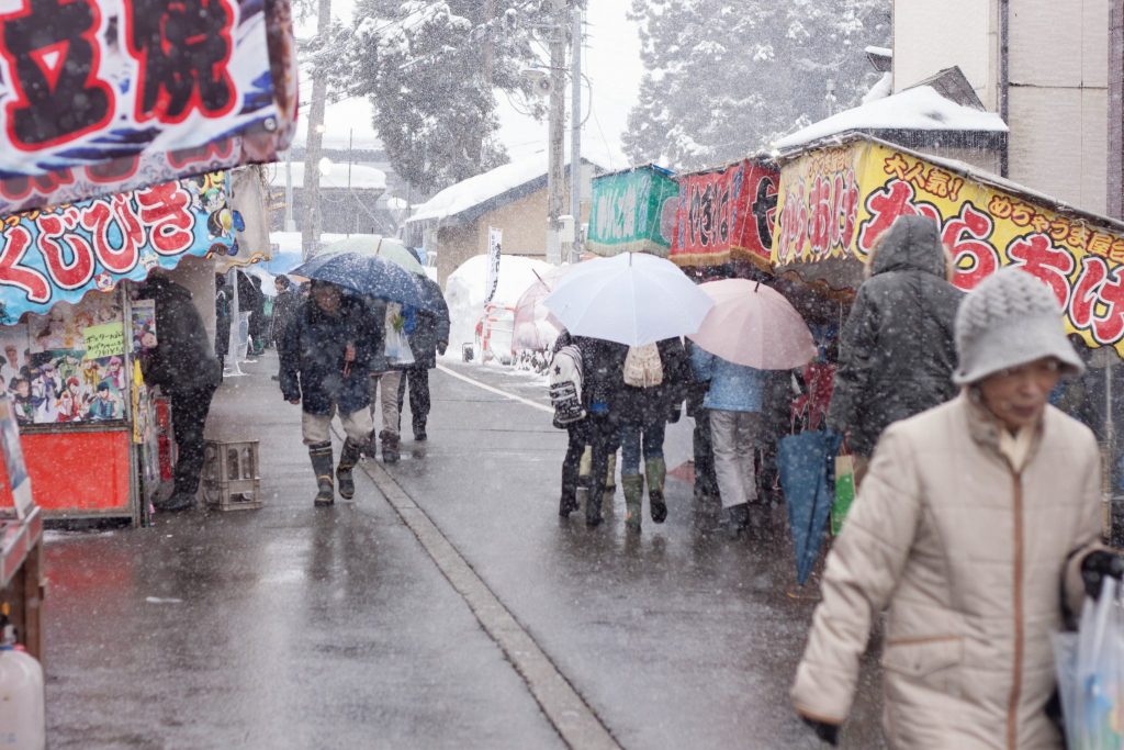 Bei diesem Festival gab es zwei Yosokoi-Gruppen. Die erste Gruppe kam aus Ikebukuro, Tokio, und nutzte das Naruko, um rechtzeitig zum Beat zu klatschen. Sie trugen leuchtende Yukata, ein wunderbarer Kontrast zum Schnee. Die zweite Gruppe war eine lokale Yosokoi-Gruppe und wählte eine eher zurückhaltende Farbe für ihre Kleidung, fügten stattdessen Katzenmasken und eine extra Portion Energie hinzu. Dieser Tanz hat mir viel Spaß gemacht und ich empfehle Ihnen, rechtzeitig zum Festival zu kommen, um ihn zu sehen.