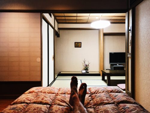 Après un trajet en bus dans les montagnes du cœur du Kyushu, je retrouve finalement un membre du personnel de Yumerindo Hanadomari, mon ryokan pour la nuit. Pour ce qui découvrent le mot, comme moi ce jour-là, un ryokan, c’est une sorte de bed and breakfast traditionnel japonais, avec dîner compris et souvent couchage sur futon et tatami. Le chauffeur me conduit donc à travers le village, puis me dépose directement à ma chambre. Une atmosphère particulière se dégage.
