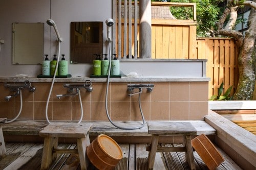 The ryokan has three outdoor baths. The night I was visiting, this one was open to women. The schedule changes every day. The other two offer a beautiful view of the castle. There is always a small room to take off your cloths and put your belongings in the wicker baskets. Then, sit on the stool, wash your body with soap, rinse well with the shower water and then soak in the hot bath to relax.