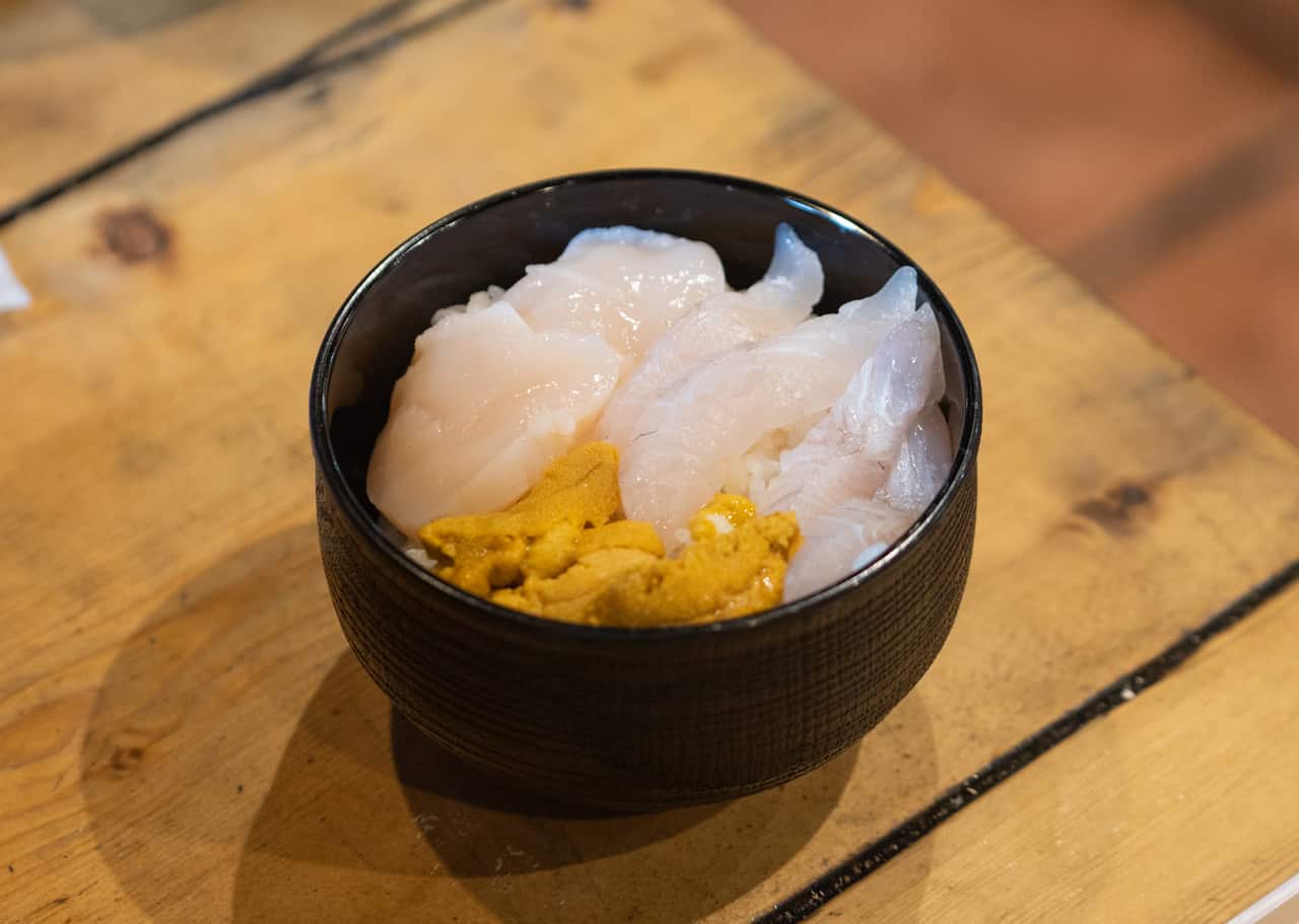 For the second part of my lunch I selected some fresh sashimi and uni from some of the vendors in the market. This included flounder, raw scallops, and a large box of immaculate uni with which I made my dream chirashi bowl.