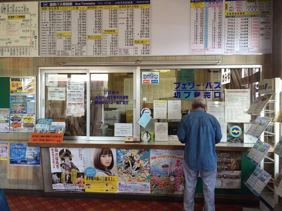 Shimatetsu ferry terminal’s inside has waiting seating facing the windows, the wall space for which is almost entirely hung with timetables and tourism posters. Only elderly lingered, facing the sightless window space, no islands to see.