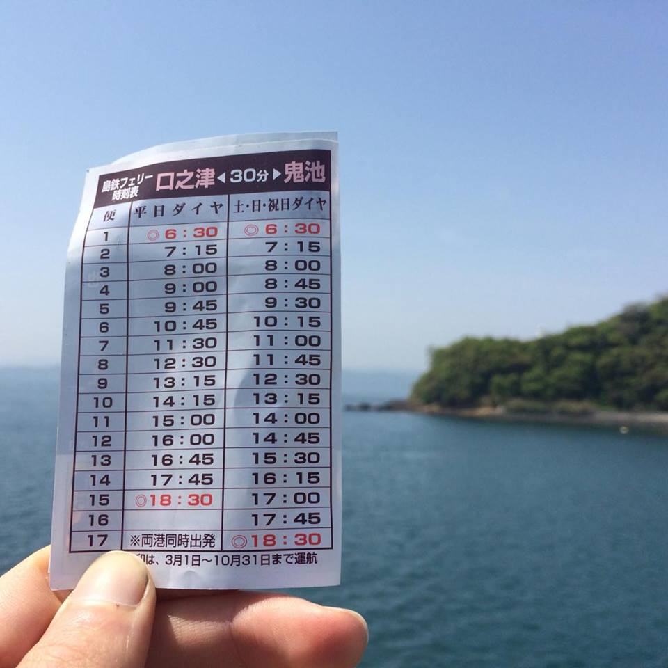 The ferry – aptly named Amakusa Ferry 1 or 2 – arrives at Kuchinotsu from the Amakusa islands alternately every 45 minutes and hour from 6:30 until 18:30.