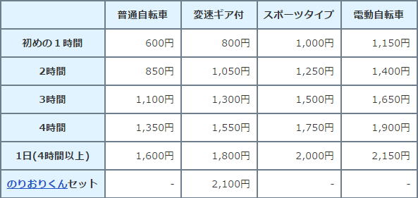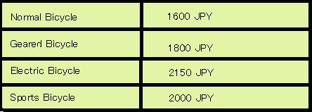 (Hourly rates on the left; columns from left to right: Normal rental bicycle, multiple gear bicycle, sports bicycle, electric-assisted bicycle. Source: JR Bus Tech)
