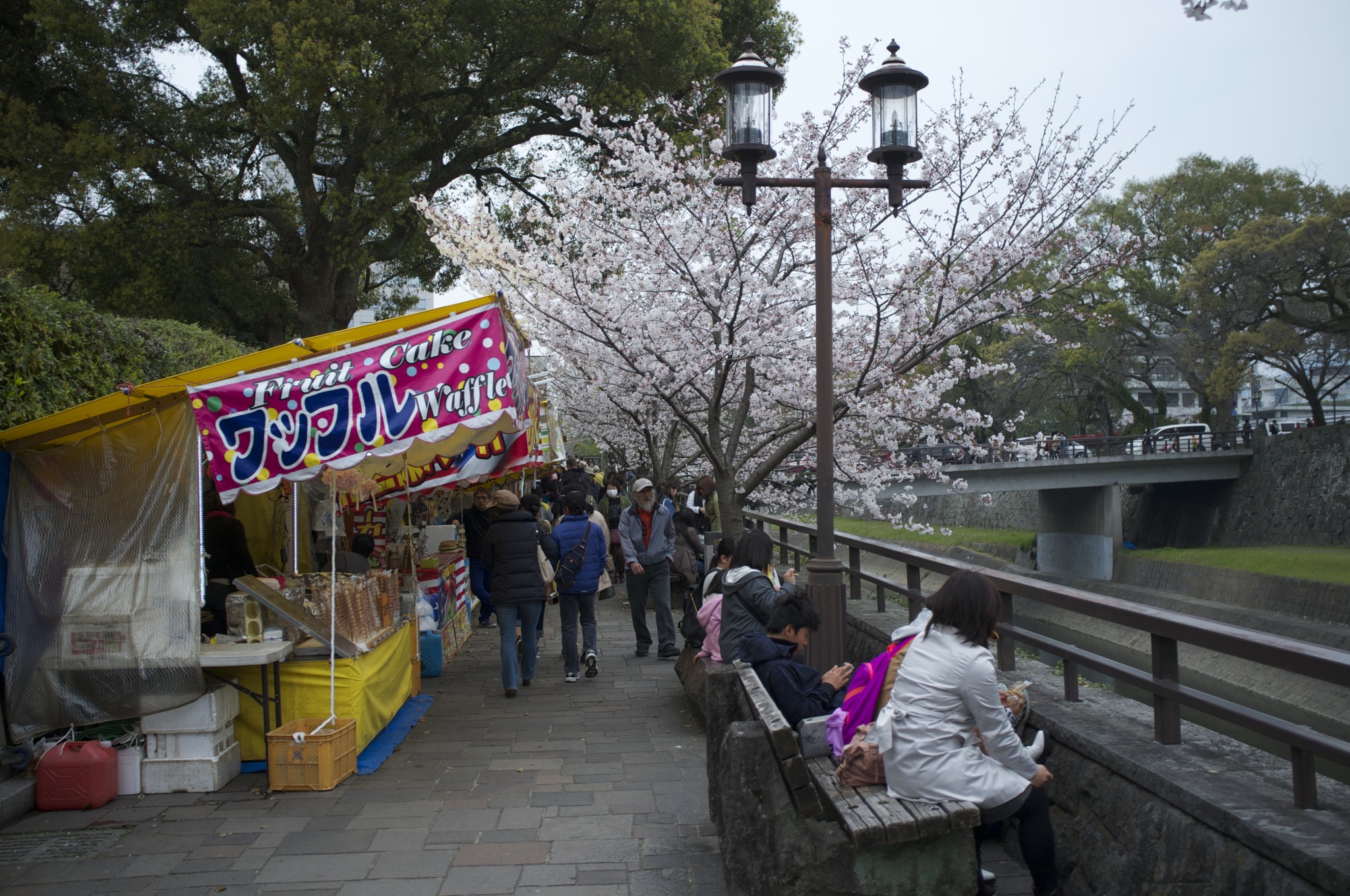 For Kumamoto city, these few weeks of cherry blossoms typically occurs from the last week of March until the second week of April. Kumamoto Castle boasts approximately 600 cherry blossom trees among its grounds, making it no struggle to find a spot to bask beneath the falling petals. It’s a customary part of hanami to gather a group of friends, family, or coworkers, bring a bento (and optionally, some saké), and enjoy a picnic amid the cherry blossom trees. However, those who aren’t ambitious enough to pack a lunch will also be in luck, as there’s a stretch along the moat of the castle that’s lined with various food stalls, as well as its own row of cherry blossom trees. These sell a number of foods, from waffles to grilled squid, providing a partially-authentic and thoroughly eclectic Japanese street food experience.