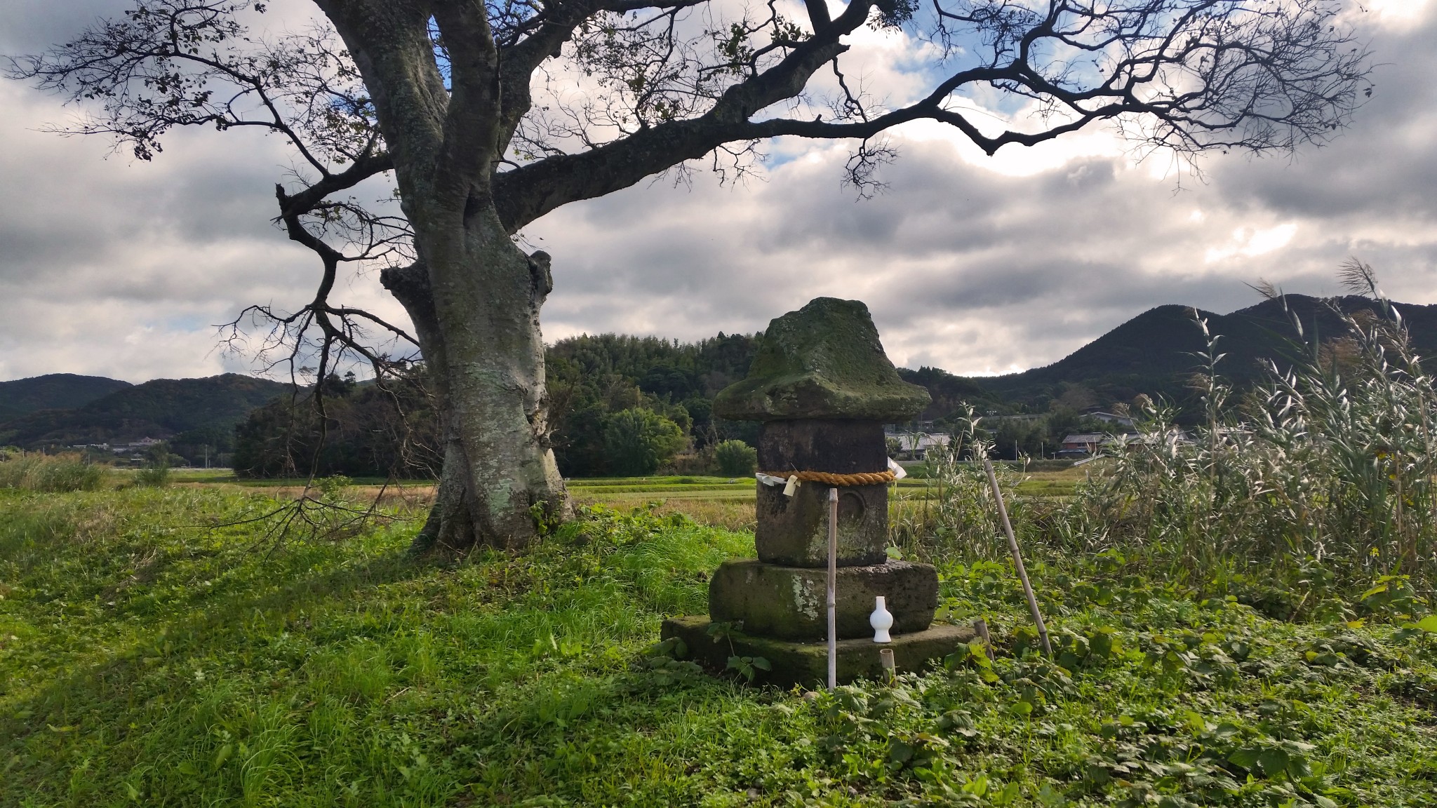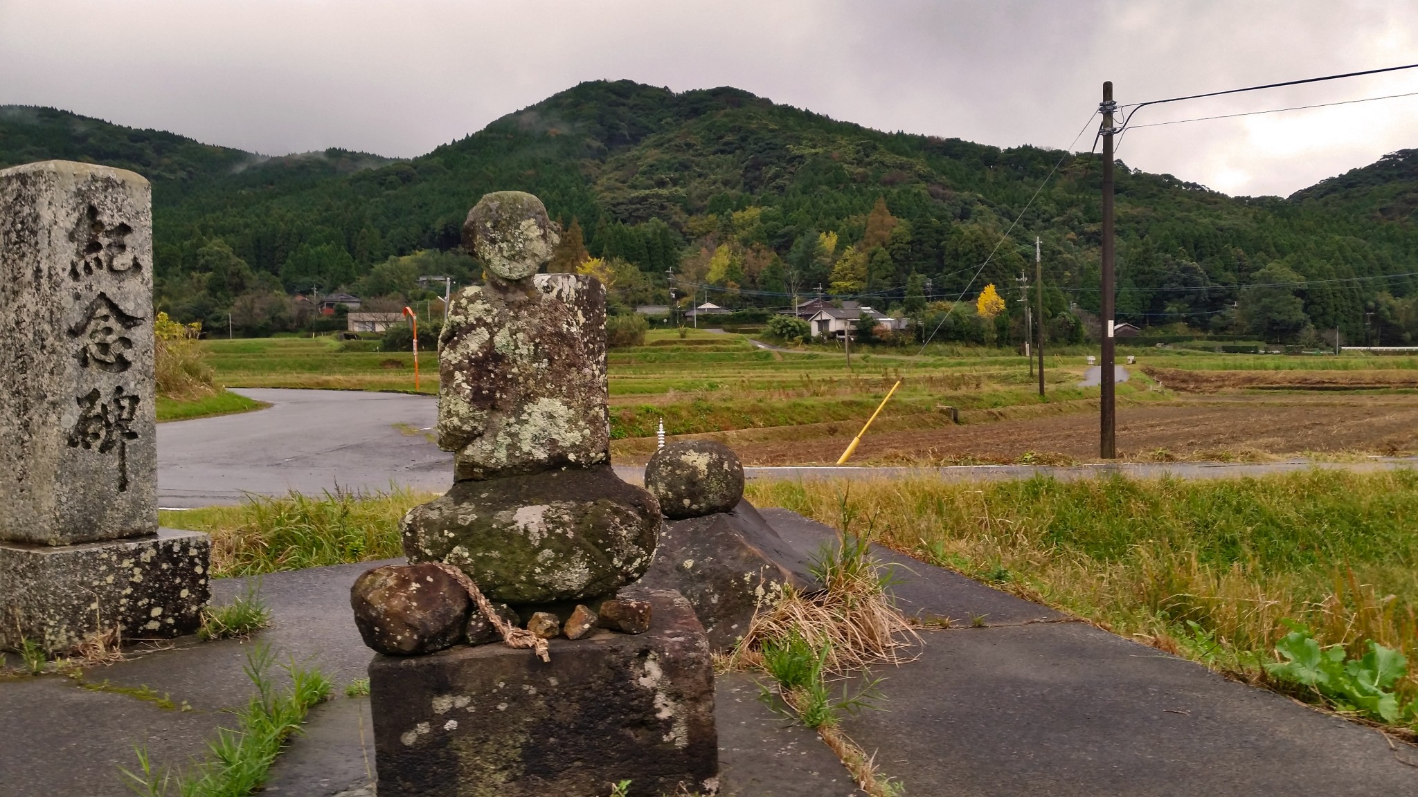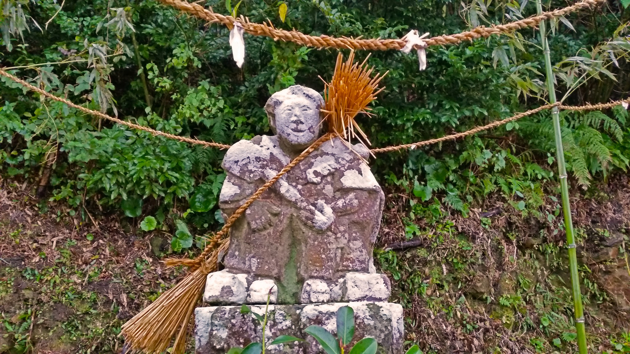 As Minamisatsuma landscape is dominated by the presence of green paddy rice fields the agricultural deities and gods appear quite frequently in the folk tales and legends. Tano Kami is believed to watch and look after the harvest of rice plants and at the same time bring a good fortune and rich harvest to the farmers. They are scattered around rice farmland where peasants put stone statues of Tano Kansa either of Buddhist or Shinto type of which their main characteristic is a red mace on the head. There is also another one called a peasant which has a main attribute of holding a pestle.