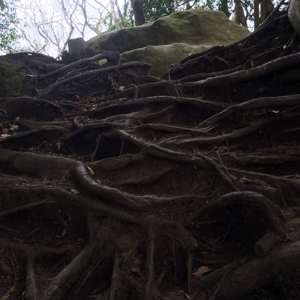 The Daibutsu trail becomes a serpentine spine. Parsed-apart roots crawl on the ground; take care avoiding these nature gnarls. Little climbs will bring you to stone fingers planted on knobs of the earthen spine. They are tattooed with cascading calligraphy.