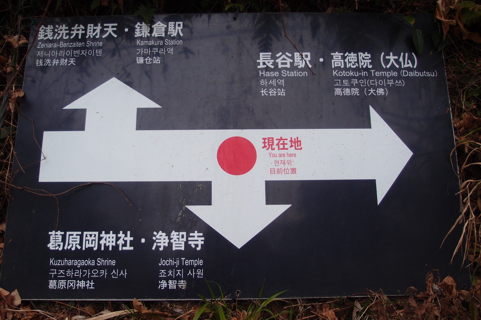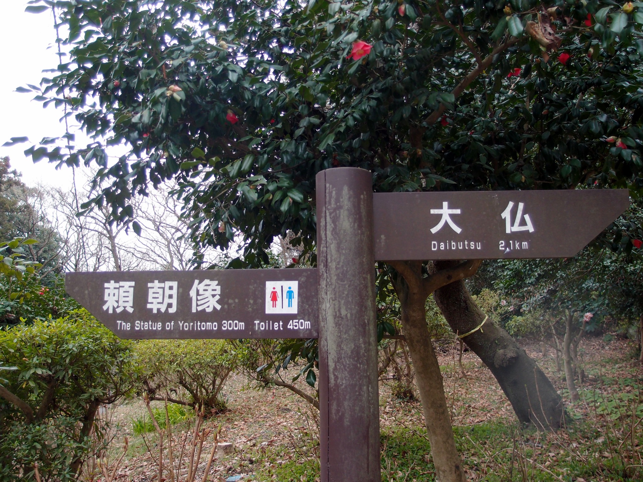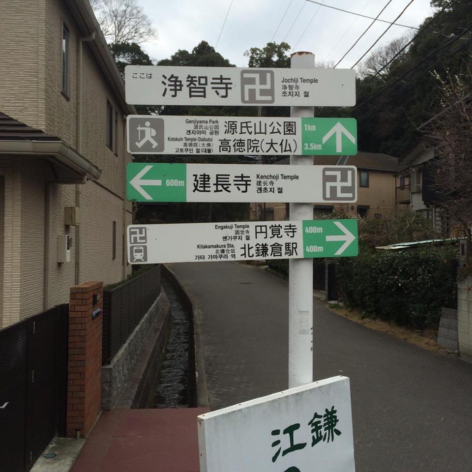 Genjiyama park is situated at the nexus point of a couple roads. Here, a vaguely circular intersection allows cars passage through the profuse nature of Kamakura hills. There, in relief for anybody concerned about directional clarity, are many signposts listing directions.
