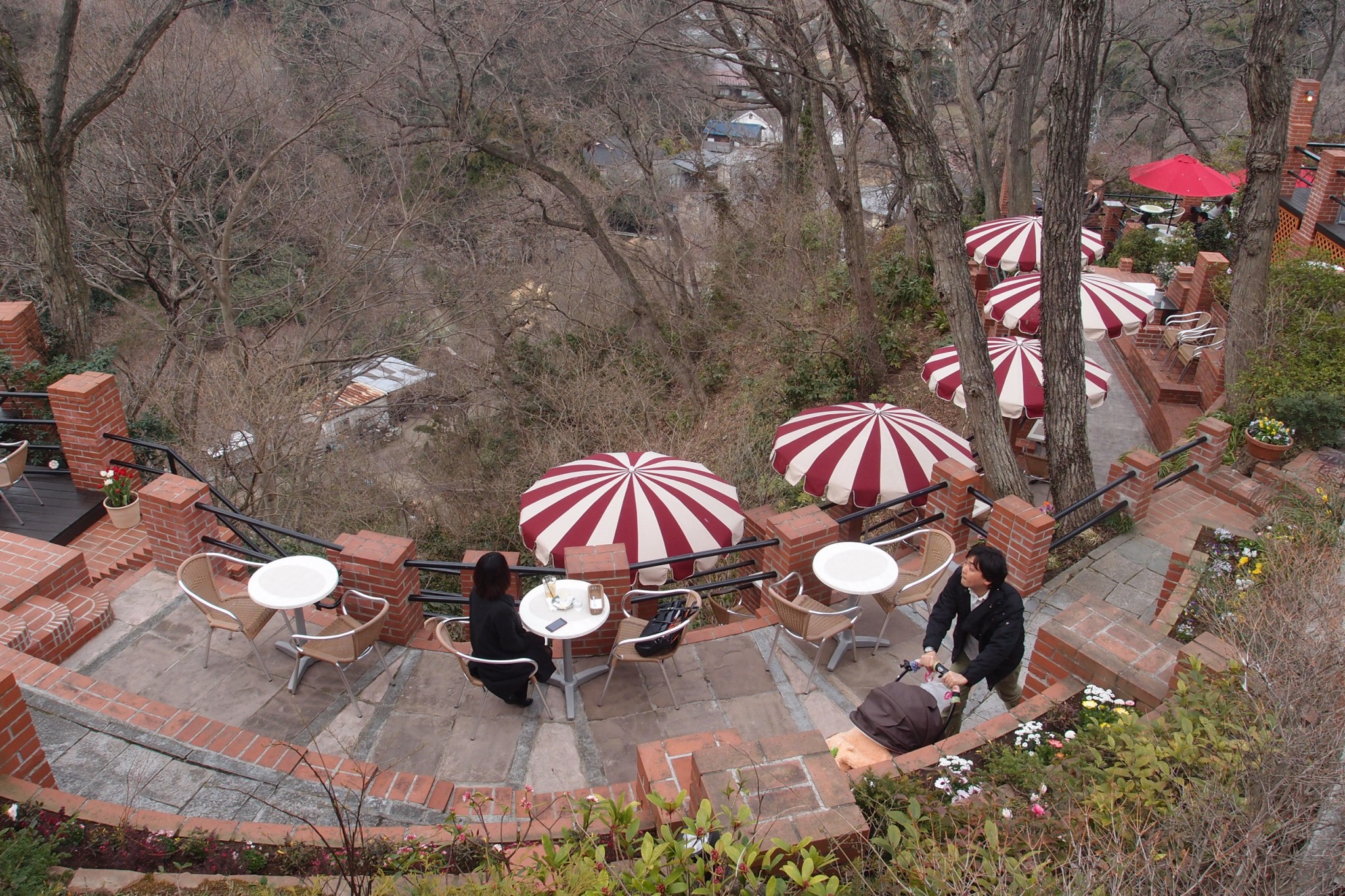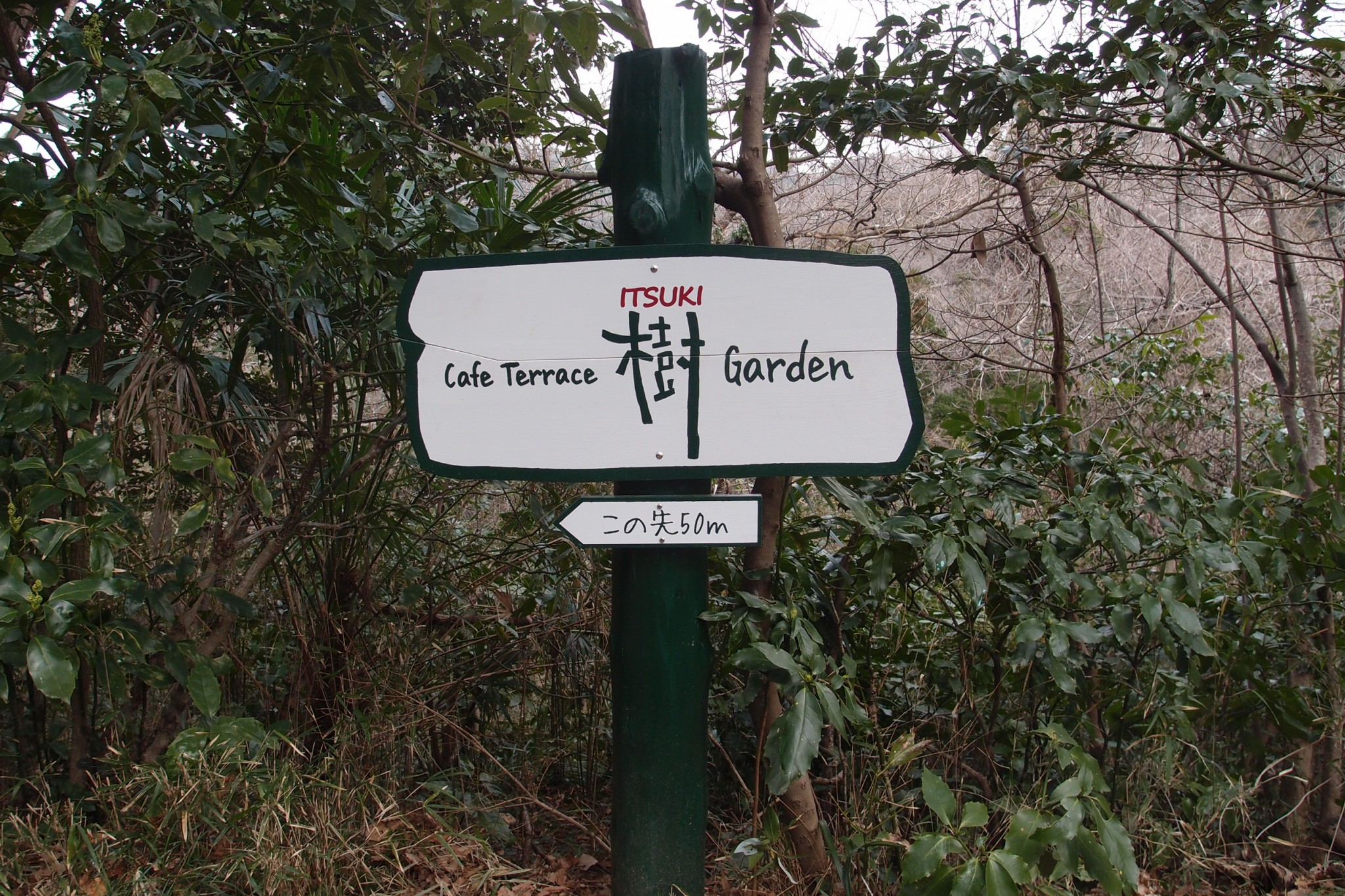 Back at a crude sign, walk on through the forested hills. If your legs are tiring and strength is waning, wait until you come to a sudden knob circled by those low grasses. Look for a painted green sign marked “Itsuki cafe.” Following a hill-inlaid stairwell, you will arrive at the cafe’s white chalet looking over its baked brick terrace. Enjoy a double shot of espresso over the cafe notch’s nature niche.