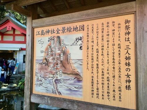 Auf dem Weg werde ich von zahlreichen Geschäften und Restaurants angelockt. Doch ich bleibe standfest, denn ich habe noch einen langen Weg vor mir. Der Enoshima-Schrein ist der Göttin Benten gewidmet, der Matronin für Glück, Wohlstand, Musik und Wissen. Der Legende nach hat sie Enoshima erschaffen, nachdem sie einen fünfköpfigen Drachen erledigt hat. Kein Wunder, dass die Göttin hier auf der Insel eine so große Rolle spielt!