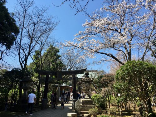 Der stationsreiche Weg endet jedoch nicht beim Enoshima-Schrein. Es gibt noch mehr zu entdecken! Ich folge den Menschen vor mir und den Wegweisern am Wegesrand, die mich gleichermaßen zu einem schönen Fleckchen Natur führen. Dort, zwischen Kirschbäumen und grünen Kiefern, erblicke ich einen weiteren Schrein. Schlicht gehalten, mit einem Tori-Tor aus Stein und dezenten Farbakzenten, wirkt er wie eine Oase der Ruhe.