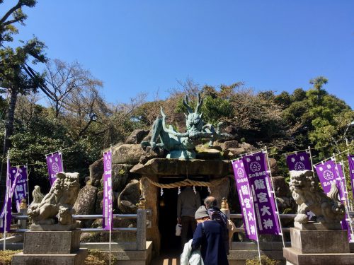 Die gesamte Zeit über fühle ich mich wie auf einem Pilgerweg der Ruhe und Gesinnung. Zwischen Schreinen, Natur und dem Rauschen der Wellen vergesse ich meine Probleme und konzentriere mich auf die Schönheit von Enoshima. Je höher ich den Berg hinaufgehe, desto mehr komme ich zur Ruhe. Ein Wink des Schicksals, dass sich plötzlich vor mir der Eingang zu den Iwaya-Höhlen auftut. Ein Drache am Eingangstor weist auf den legendären Drachen hin, der Enoshima belagert haben soll. Heute fühle ich aber nicht das Verlangen nach einem spannenden Abenteuer und überlasse anderen Besuchern den Vortritt.