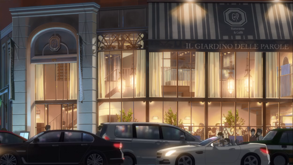 Das italienische Restaurant, in dem Taki in Teilzeit arbeitet, ist eine fast exakte Kopie des Café la Bohème, abgesehen von der Gestaltung des Eingangs und der Tatsache, dass es, im Gegensatz zu seinem fiktiven Gegenstück, in einer ruhigen Straße mit kaum Verkehr liegt. Die Lage dieses Restaurants ist so bedeutsam, da es direkt vor dem Shinjuku Gyoen liegt, dem wunderschönen Park, in dem der größte Teil der Szenen von The Garden of Words, einem ebenfalls von Shinkai inszenierten Film, spielt.