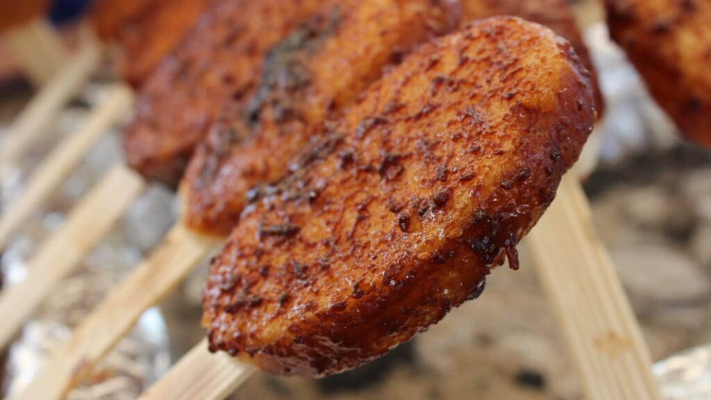 Ein weiteres regionales Produkt, dessen Popularität nach seinem Erscheinen im Film zugenommen hat, ist das Gohei Mochi, eine Spezialität der Chubu-Region, die aus gebackenen Mochi-Spießen besteht, die mit süßer Sojasauce überzogen sind.