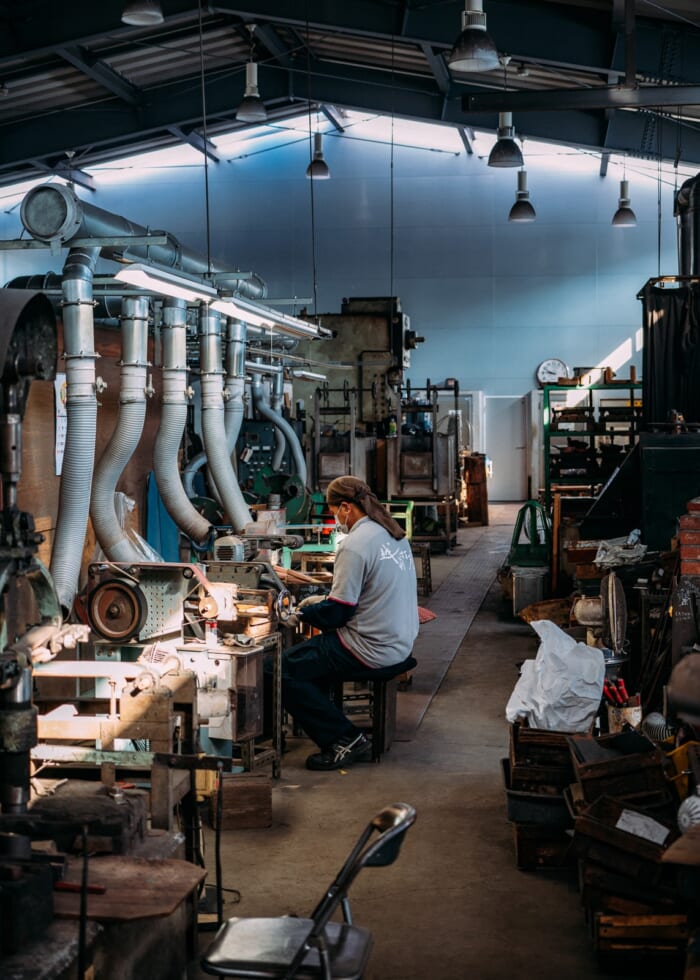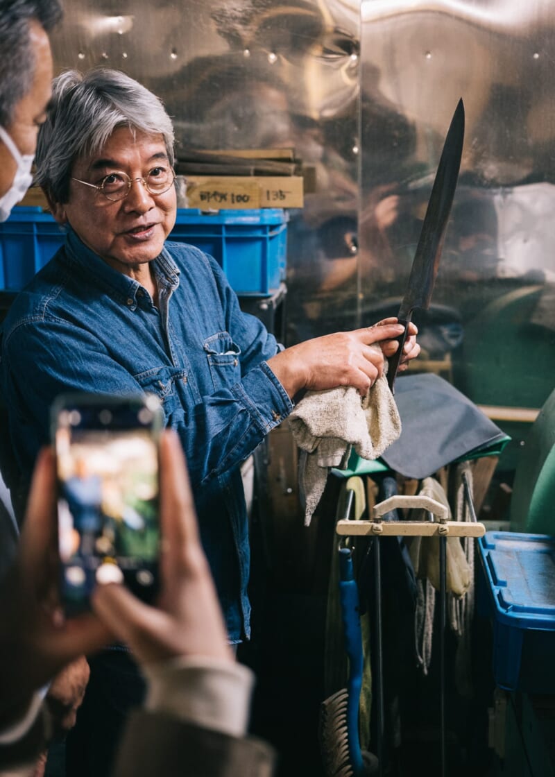 Dreizehn Messerfirmen stellen jeweils ihre eigenen Produkte in der Werkstatt her, und auch viele Handwerker fertigen und produzieren hier ihre eigenen Produkte. Früher produzierten die Unternehmen im Stadtzentrum von Takefu, bevor sie in diese gemeinsame Werkstatt in einem Vorort umzogen. Das lag zum Teil an der Verlegung der Werkstatt nach Echizen City, aber auch an dem Wunsch, das “Echizen Uchihamono” nicht untergehen zu lassen. Unternehmen, die einst Konkurrenten waren, schlossen sich zusammen, um die Fertigkeiten und den Geist von Echizen Uchihamono hier zu verfeinern. Die Werkstatt produziert heute Klingen, die in der ganzen Welt anerkannt sind.