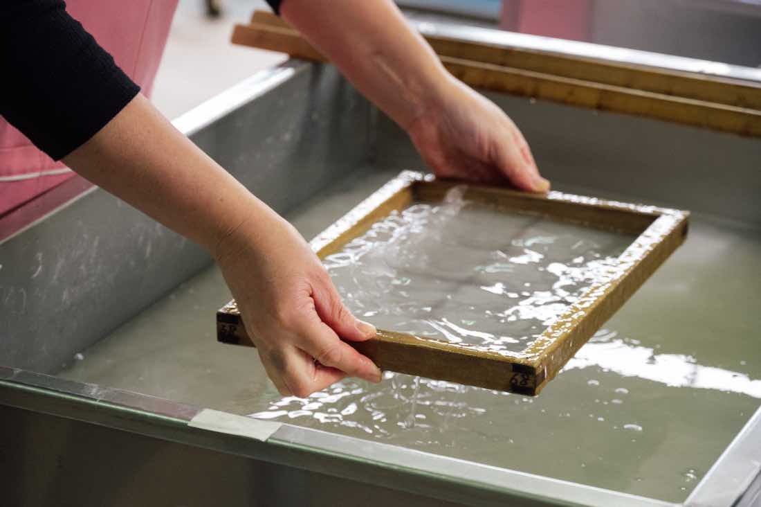 Iwano Heizaburo Seishisho Co., Ltd. liegt in den Bergen dieses Dorfes. Die in der Meiji-Ära (1868-1912) gegründete Werkstatt blickt auf eine über 150-jährige Geschichte zurück und ist eine der größten Werkstätten für handgefertigtes Washi-Papier in Japan. Viele Kunsthandwerker stellen hier Papier von Hand her, ein Blatt nach dem anderen, unter Verwendung eines mit Wasser gefüllten Wassertanks und Materialien aus verarbeiteten Pflanzenfasern, bekannt als “Sukibune”. Einer der Punkte, die die Qualität des Papiers bestimmen, ist seine Dicke. Die Dicke des Papiers kann nur durch die jahrelange Erfahrung der Handwerker bestimmt werden, was das wahre Zeichen eines Meisters ist.