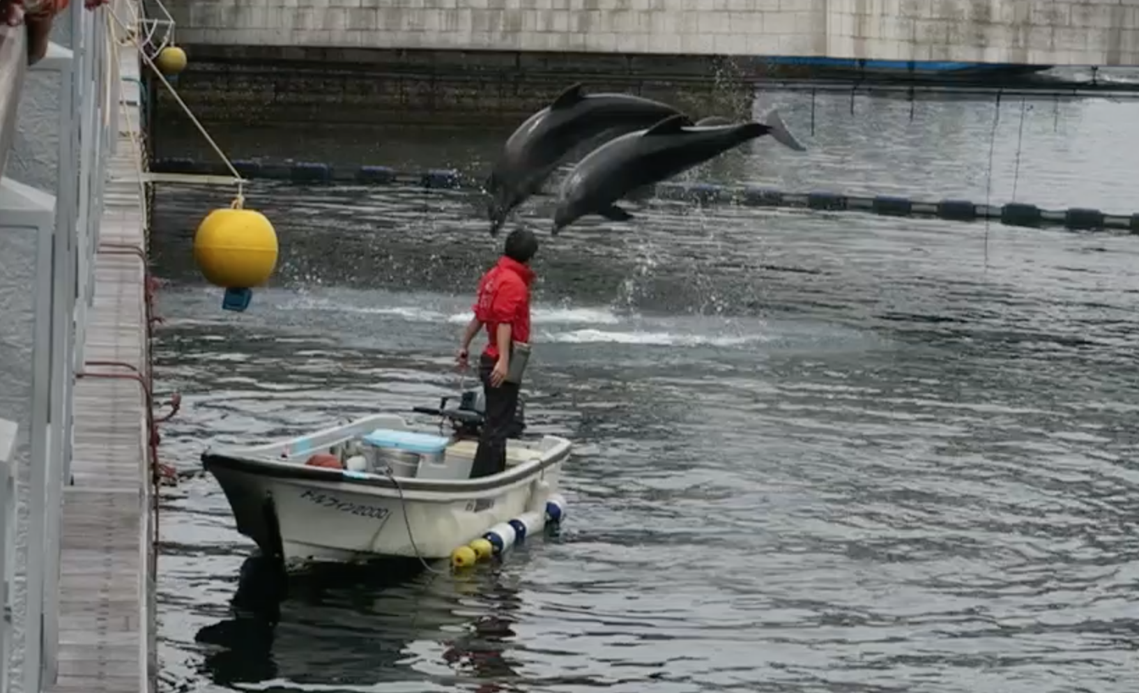 The dolphin trainer was in a boat, making various arm gestures or certain sounds to instruct the two dolphins. Every so often the dolphins would disappear into the water before bounding into the sky, sending water spraying in every direction. The height they achieve is impressive enough, but couple this with the almost complete unison that the two dolphins achieved, and it may have you rubbing your eyes in disbelief.