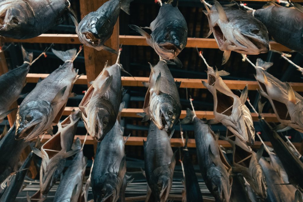 El salmón se cuelga del techo en el interior de la tienda, en la oscuridad, hasta que termina de secarse. Es una imagen muy fotogénica, digna de visitar en Murakami. ¡Incluso podemos traernos una camiseta o un muñeco de vuelta a casa con la imagen del salmón seco! Y, como no podía ser menos, también podemos comprar el propio salmón. Al estar seco lo podemos transportar en nuestra maleta en el avión sin ningún problema.