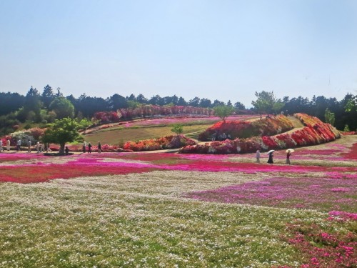 Las otras flores que, en silencio, colorean el fondo del escenario para darle a las azaleas el protagonismo son las preciosas Shiba-Sakura o “flores de cerezo de pasto”. Conocidas como Plox rastrero o Plox de montaña, estas florecillas multicolores llenan el campo haciéndolo parecer un paraíso terrenal.
