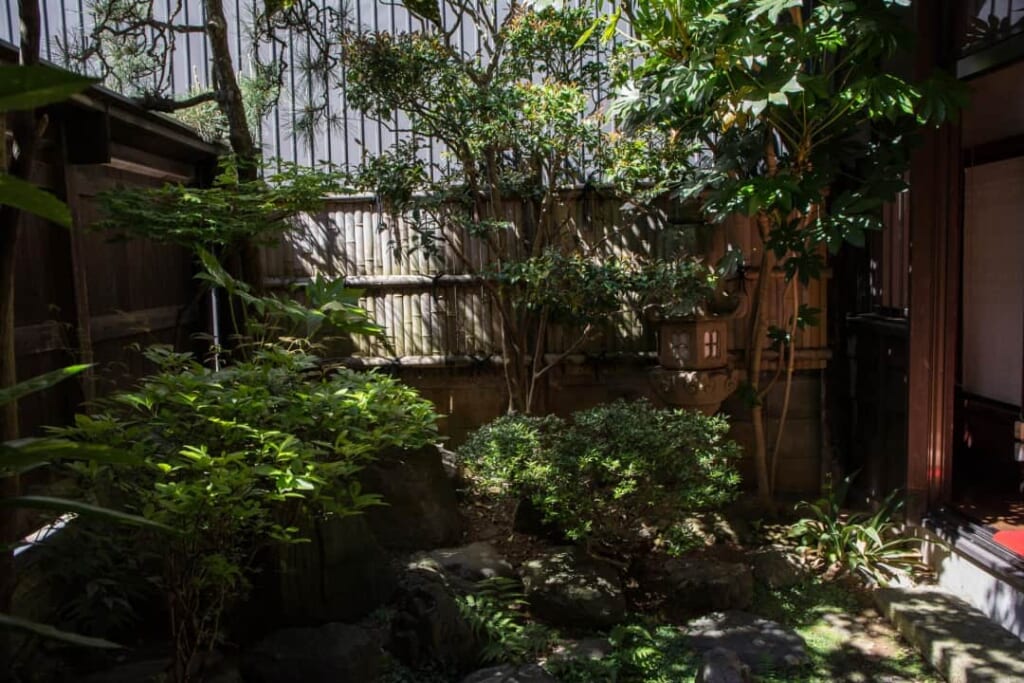 En esta acogedora tienda de té podremos disfrutar de cómodos suelos de tatami y de un cuidadísimo jardín trasero.
