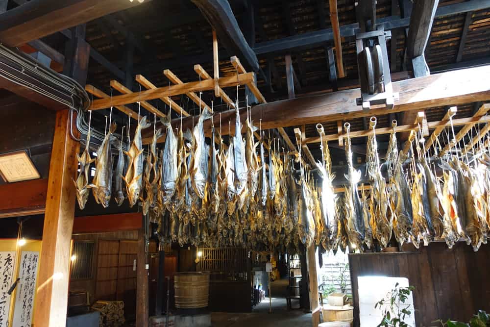 En esta tienda, puedes observar el proceso de secado del “Sake-no-sakabitashi” (salmón empapado en sake japonés), que se realiza secando el salmón shiobiki durante aproximadamente tres semanas y luego conservándolo durante seis a doce meses.