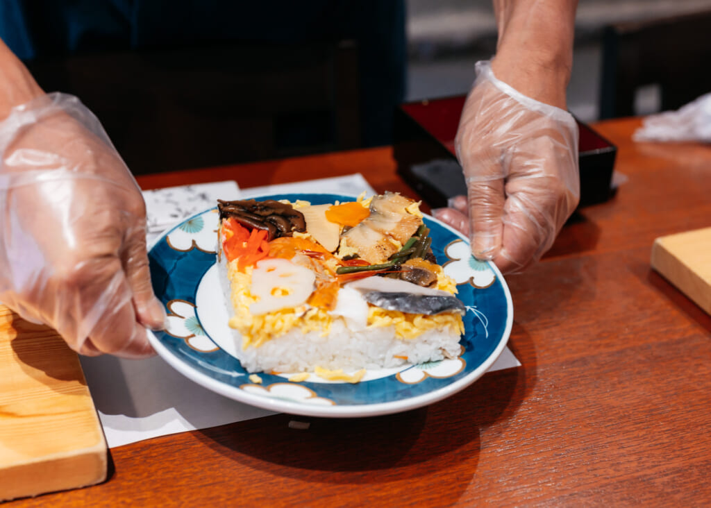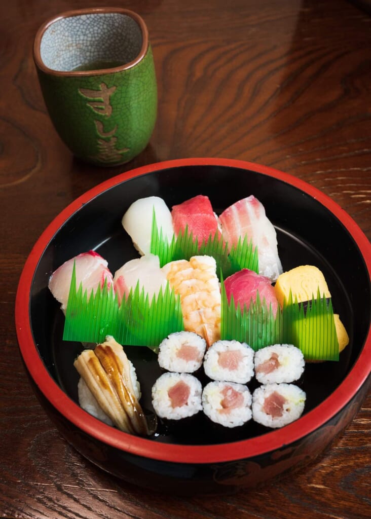 Se dice que este tipo de sushi con una bonita forma redonda se originó en Kioto, para que las maiko, las aprendices de geisha, pudieran comerlo de un solo bocado para no estropear su maquillaje. Actualmente, lo podrás ver en algunas cajas de bento para celebraciones como en Hina Matsuri o en ciertos restaurantes tradicionales en Kioto con diseños muy creativos.