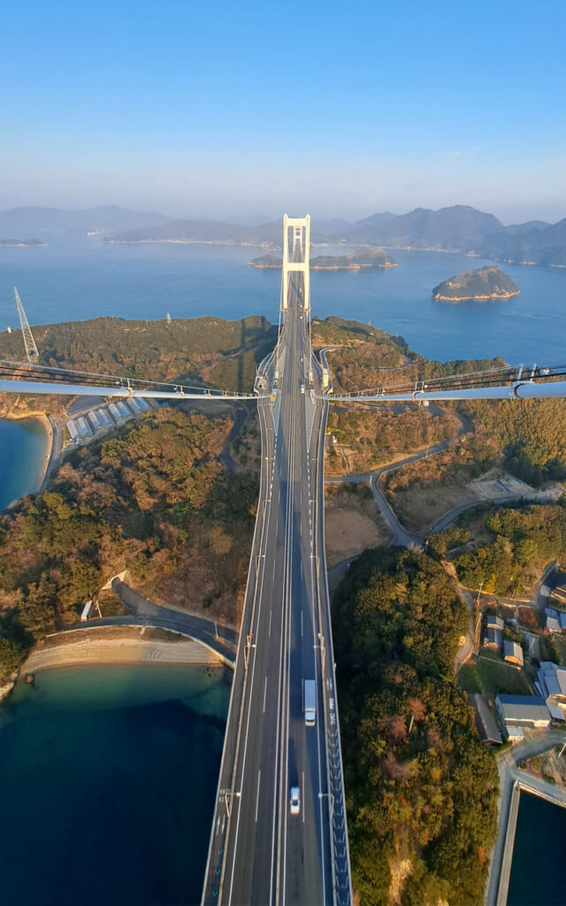 Les grandes îles sont aussi reliées par des ponts monumentaux. Shikoku est reliée à Honshu par plusieurs ponts qui enjambent de la mer intérieure de Seto et traversent ses îles. Il est même possible de faire le chemin entre Honshu et Shikoku en vélo via une piste cyclable pittoresque appelée Shimanami Kaido qui passe par ces ponts pour aller d’îles en îles.