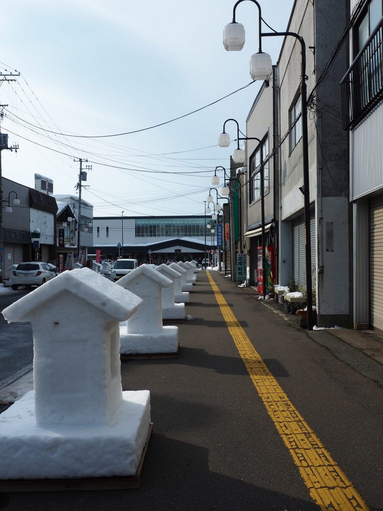 Au cœur de la ville, sous les arcades commerçantes, les habitants se sont prêtés au concours de la plus jolie sculpture de neige. À mi-chemin entre le petit temple et la niche, chaque devanture possède sa propre réalisation abritant les offrandes de rigueur.