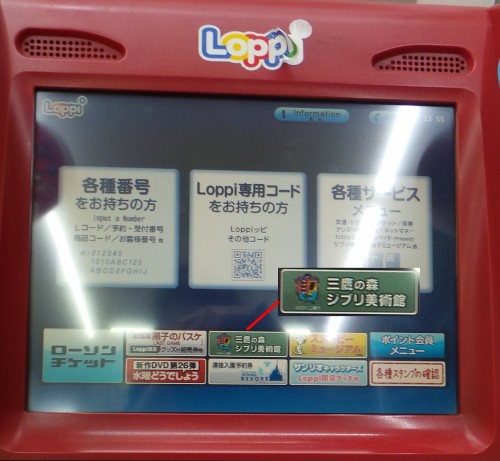 1. La machine Loppi fonctionne avec un écran tactile. Touchez l’écran pour arriver au menu d’accueil. Appuyez sur le bouton “GHIBLI MUSEUM,MITAKA” (écusson sur fond vert) sur l’écran d’accueil.