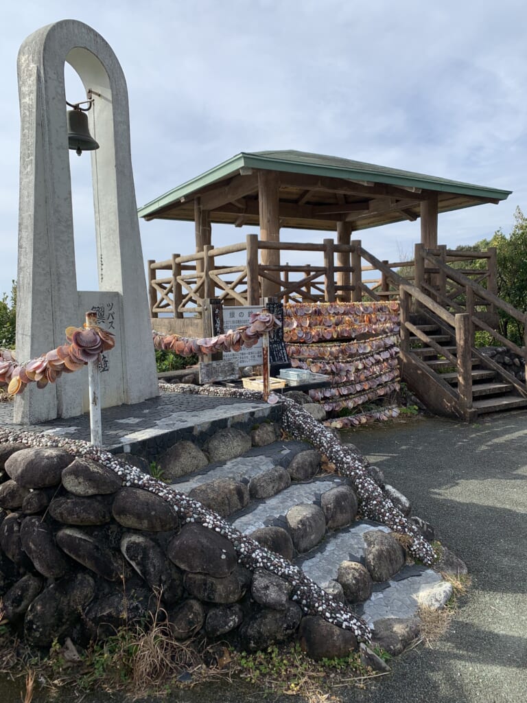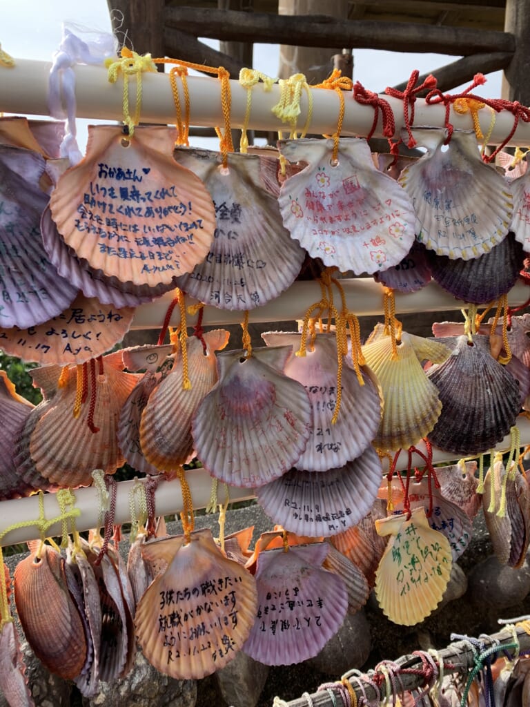 Selon la saison, un arrêt sur la longue plage d’Oyahama (大矢浜海岸, Oyahama Kaigan), peut s’assortir de l’achat de melons Nanbari (南張メロン) auprès d’un producteur local. La route 260 s’enfonce ensuite dans les forêts et s’élève dans les collines. Dans les hauteurs, à 100 m d’altitude, l’observatoire d’Isobuemisaki (磯笛峠) offre un panorama à 180 degrés sur l’entrée de la baie d’Ago et le Pacifique. Par temps clair, la vue porte jusqu’aux montagnes d’Odaigahara (大台ヶ原山, Odaigahara yama). Les ema, plaques de prières, sont ici des coquillages : un indice supplémentaire rappelant que nous sommes dans une région héritière d’une longue tradition de pêche — notamment à la bonite et au thon. L’observatoire est orienté plein sud, et les rayons du soleil se reflètent sur les eaux en mille éclats de lumière. On dit que le soleil couchant apporte ici sa moisson d’argent…