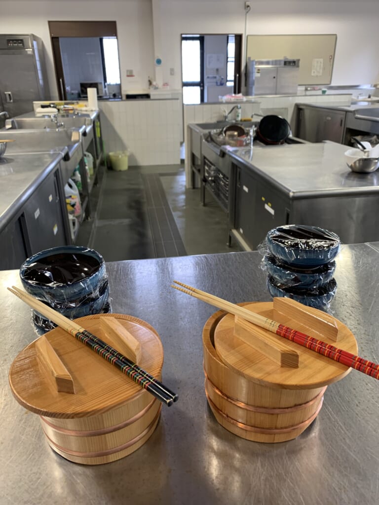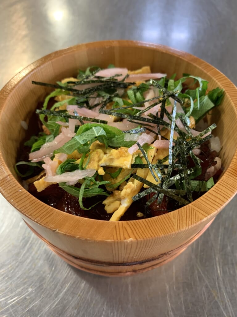 Le plat est servi dans un sushi oke ou hangiri. Ce récipient circulaire en bois de cyprès est destiné à l’assaisonnement et au service du riz vinaigré, le riz à sushis.