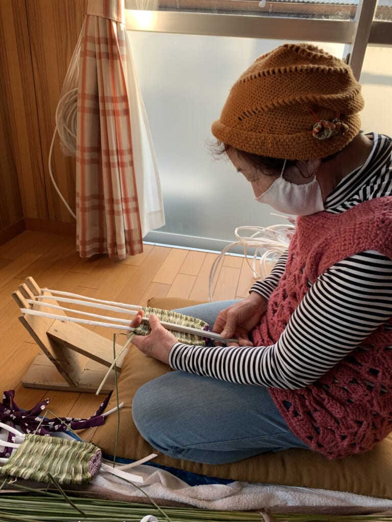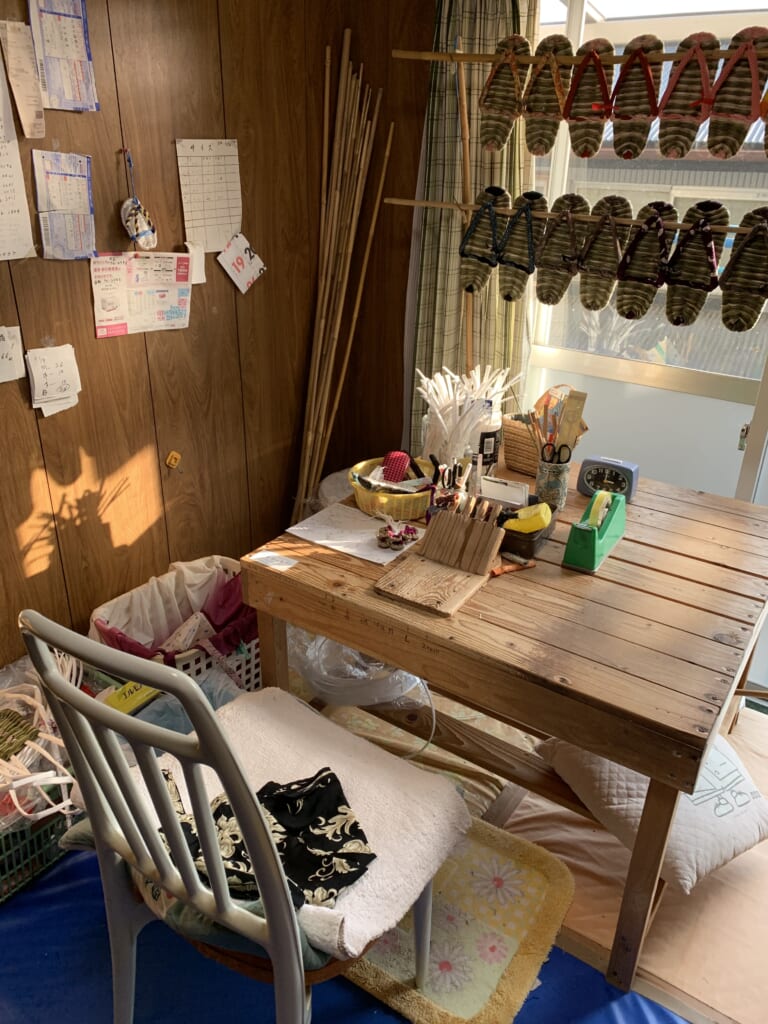Dans son atelier de Shima, Hiromi Kitamura fabrique des zori en tressant l’igusa. Le tressage des joncs reprend le même principe que la couture. On tresse, puis on resserre en compressant les entrelacements de paille. La professionnelle à l’œuvre nous fait une démonstration des mouvements du tressage avec virtuosité. Une fois entièrement tissées, les semelles sont égalisées à l’aide d’un petit maillet de bois, car tout l’enjeu est d’arriver à une symétrie des deux zori.