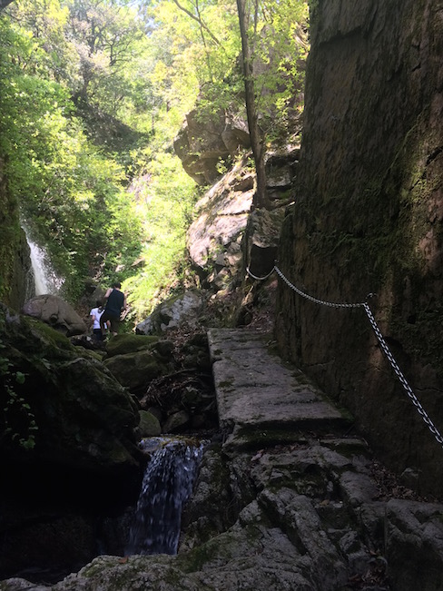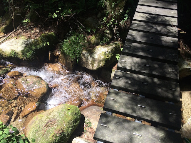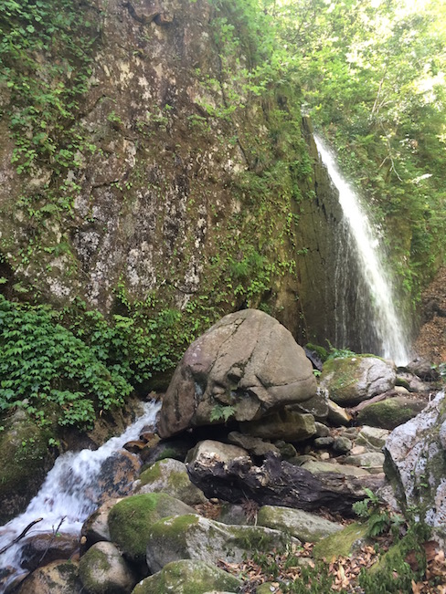 You would never expect there to be a beautiful hike behind an electricity plant out in the inaka. But then again, the big open sky and endless fields of rice paddies seem to hold a lot of secrets only the locals seem to know for generations. I was weary and unsure as my friend drove us past said electricity plant only to park in the grass by a wire gate surrounding a forest. But sure enough, there stood a large sign for the mysterious hike ahead: Byobu-ga-taki, the Byobuga waterfall. My friend Stefan opened the gate, we followed. Along the way the only other person we came across was an elderly Japanese man who seemed to be scavenging for wild cooking ingredients. Apparently wild wasabi plants and mushrooms are possible harvests in the woods. He beamed a smile our way, as bright as the sunlight coming in through the cracks of the tall evergreen trees. We exchanged hellos as he hummed and disappeared into the woods and we followed the trail along the water stream.