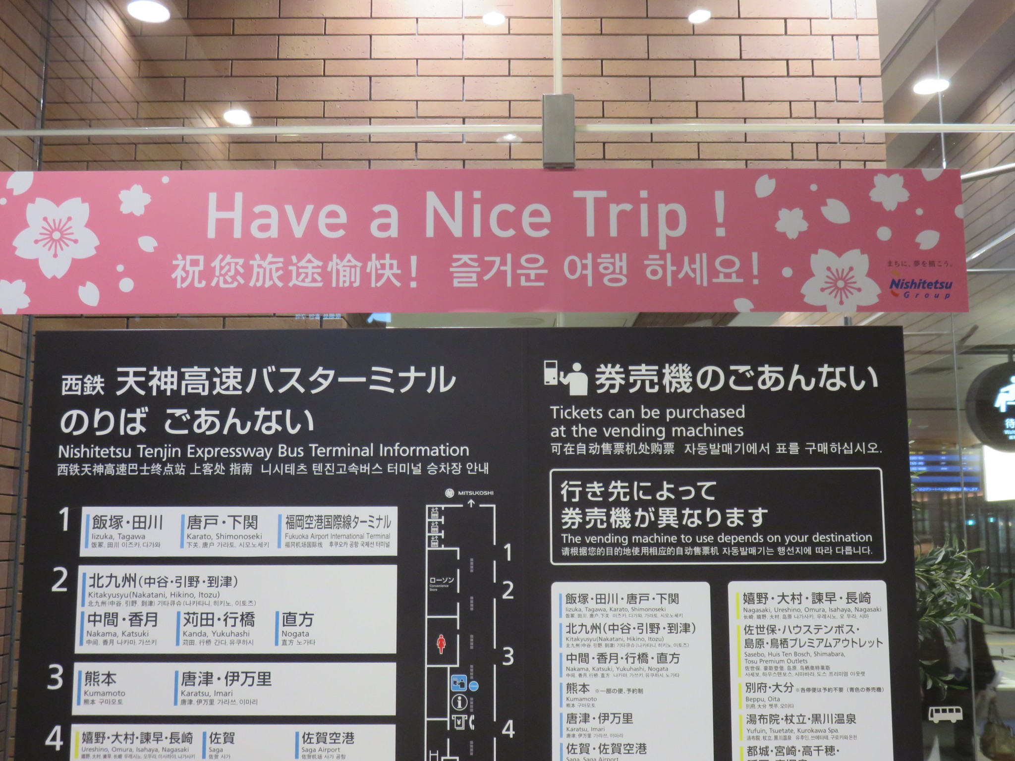 In the recently refurbished Tenjin terminal, everything is well organised and easy to find. The new design feels almost like an airport with the various gates and comfortable waiting areas. Computer screens by the entrance display all the information for departures in English and are constantly updated.
