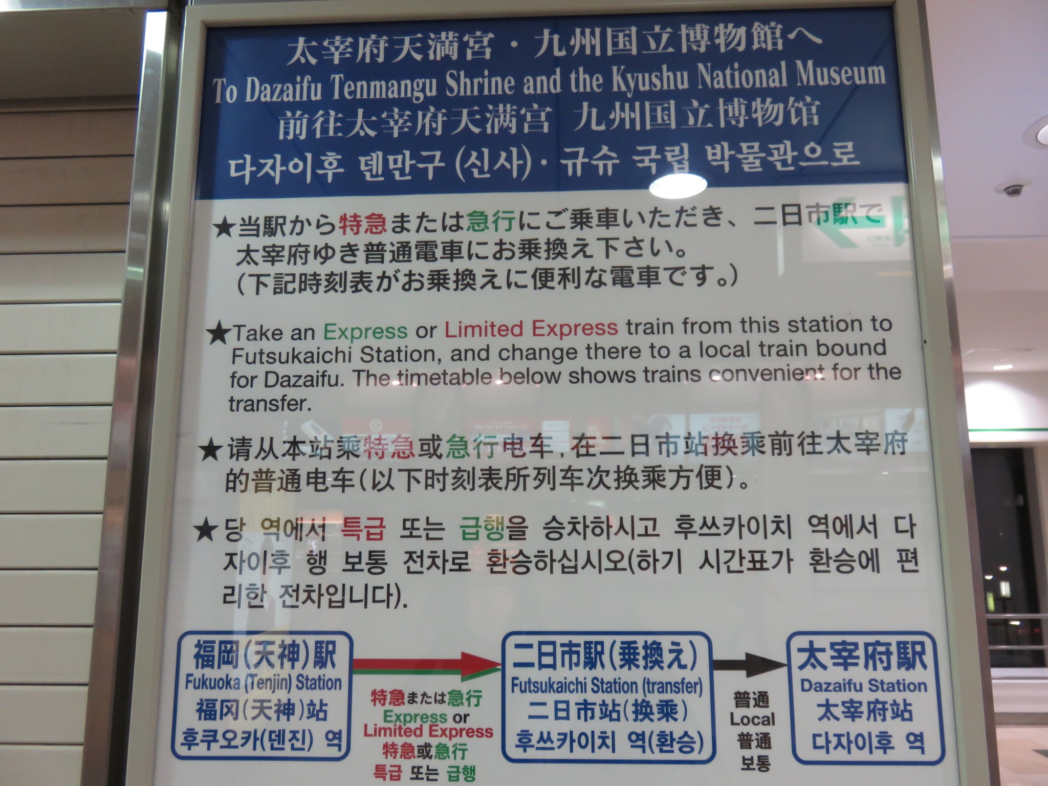 Some locations in Fukuoka are not accessible by JR but can be reached by a Nishitetsu train, like Dazaifu. There’s one transfer on the way, and due to its popularity with tourists there are clear instructions on how to get there. Signs by the ticket machines also display the fare for Dazaifu.
