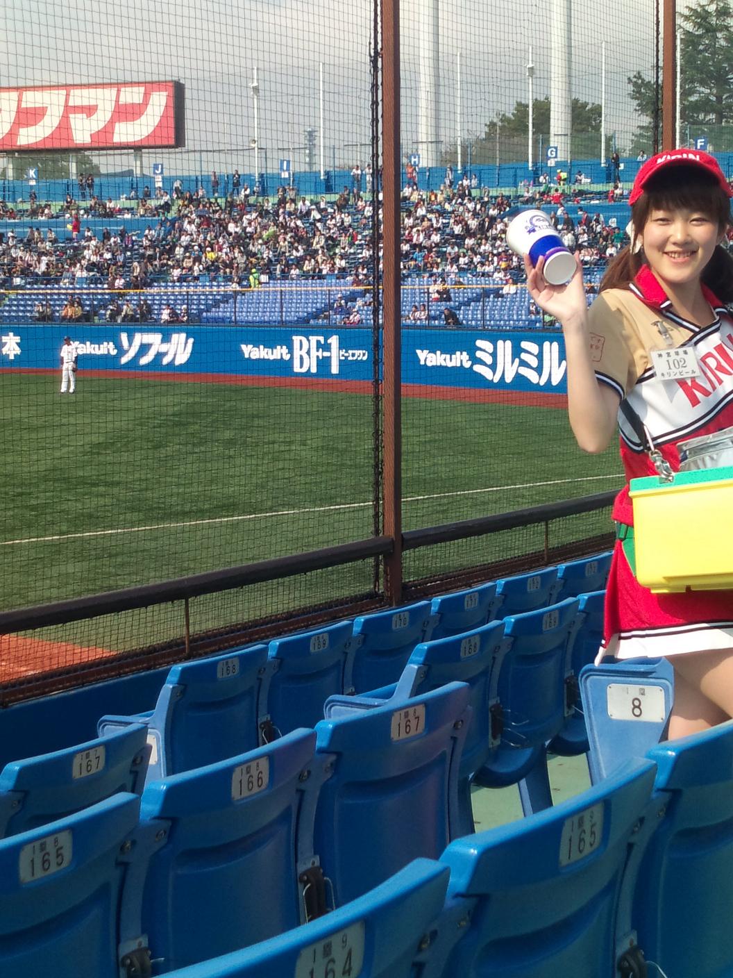 During the game you might get hungry and each stadium has a wide variety of food ranging from local flavors to KFC to Baskin Robbins. The prices are not that bad as a plate of yakisoba will cost you about 500 yen. The beer on the other hand will set you back about 700 to 800 yen for a cup. Beer is served by women who mostly carry a keg on their back or have a basket of cups as seen in the photo below.
