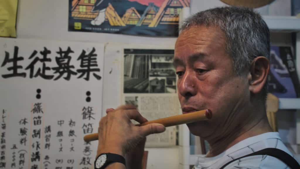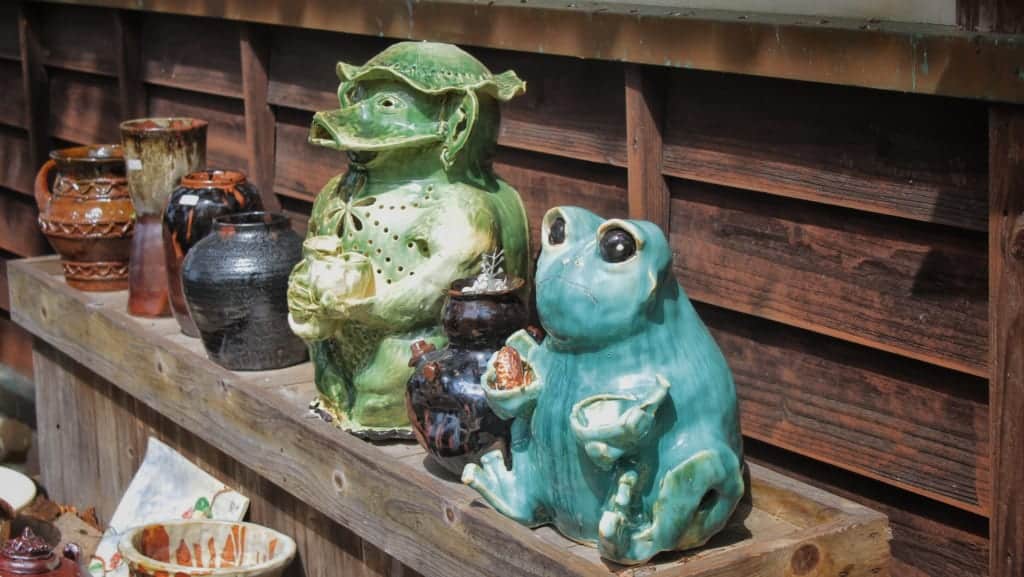Strolling through the museum-village we paused to investigate a ceramics workshop with some amusing pieces among its more elegant ones. We passed a café that offers homemade ume (Japanese plum) juice, a refreshing treat on hot summer days. Ancient music drifted through the air from Yama Biko, a music workshop, played by the owner, who enjoys sharing his love of classical Japanese instruments with his visitors. He makes his own instruments and invites guests to play along with him.