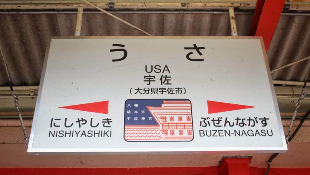 Our train ride led us to Nishiyashiki station, only a few minutes from Usa. Nishiyashiki station is one stop from Usa station, as seen in the picture above. Inspecting the sign found on the Usa station’s platform, I wondered if depicting Usa City’s flag similarly to the American flag was a conscious decision. After asking a local source, I can confirm that this clever design choice was most definitely intentional.