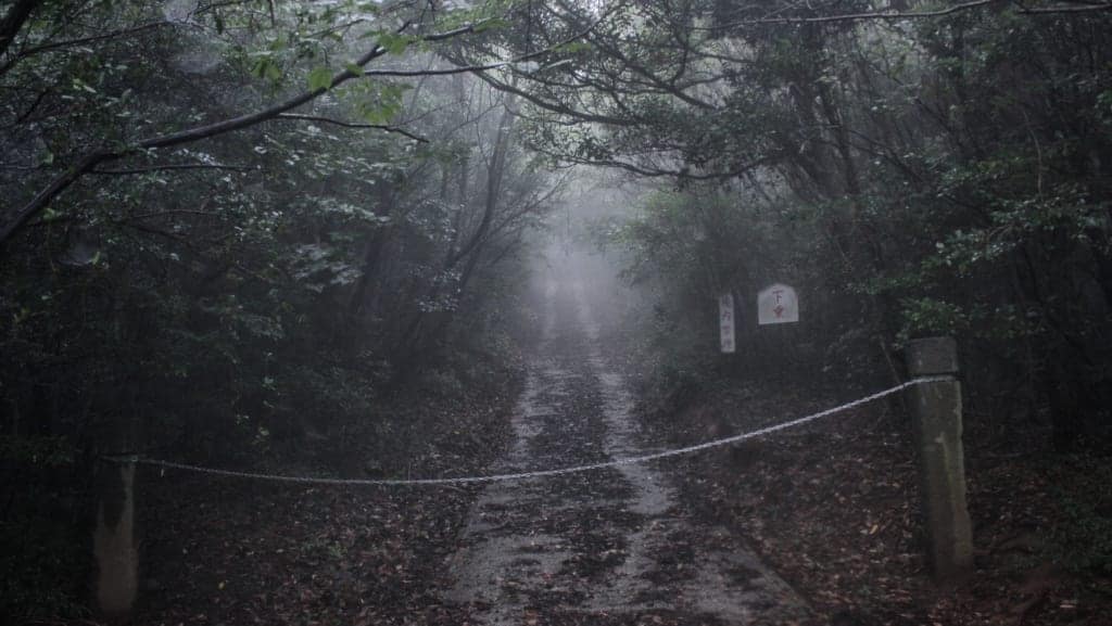 The concrete path had slowly transitioned into a dirt road, growing more and more narrow as the fauna became thicker as we climbed. We ascended into the fog and clouds we had seen from the foot of the mountain. Our entire surroundings were in the midst of a sea of clouds. Everything around us was muted in hazy shades of grey creating an indistinctness between the leaves, branches, and individual trunks. We truly felt as if we had entered a world unlike our own. Initially, Mount Omoto had welcomed us with heavy rain, but the rainfall now felt natural to us, as if we had a spiritual connection with the landscape around us.