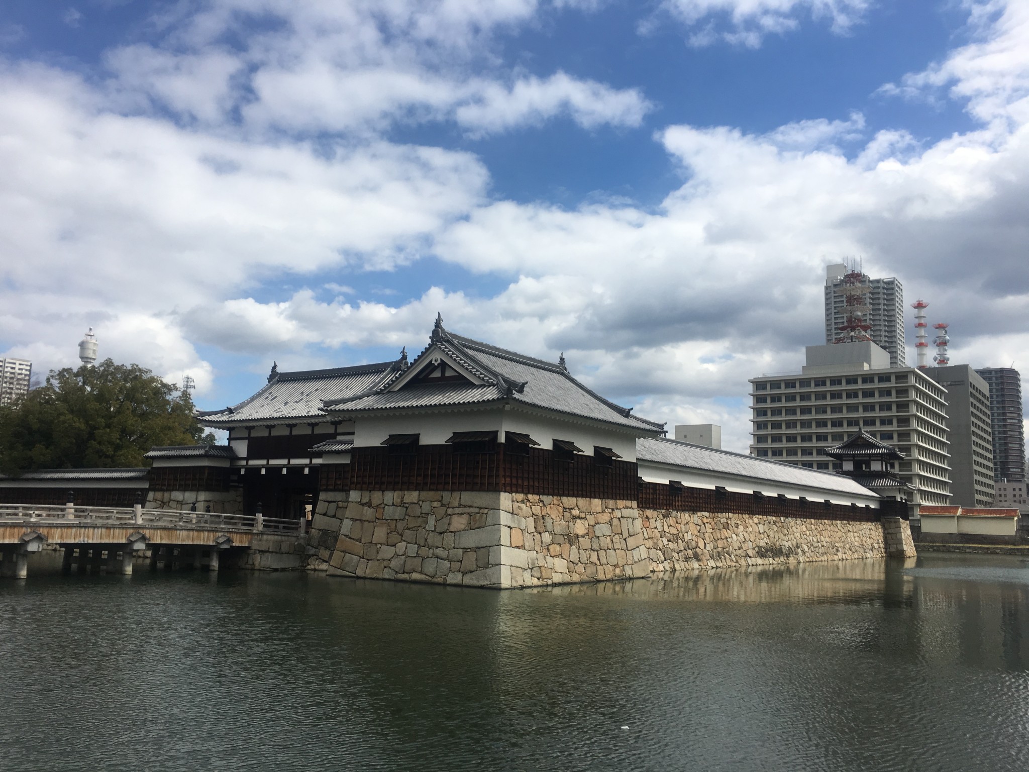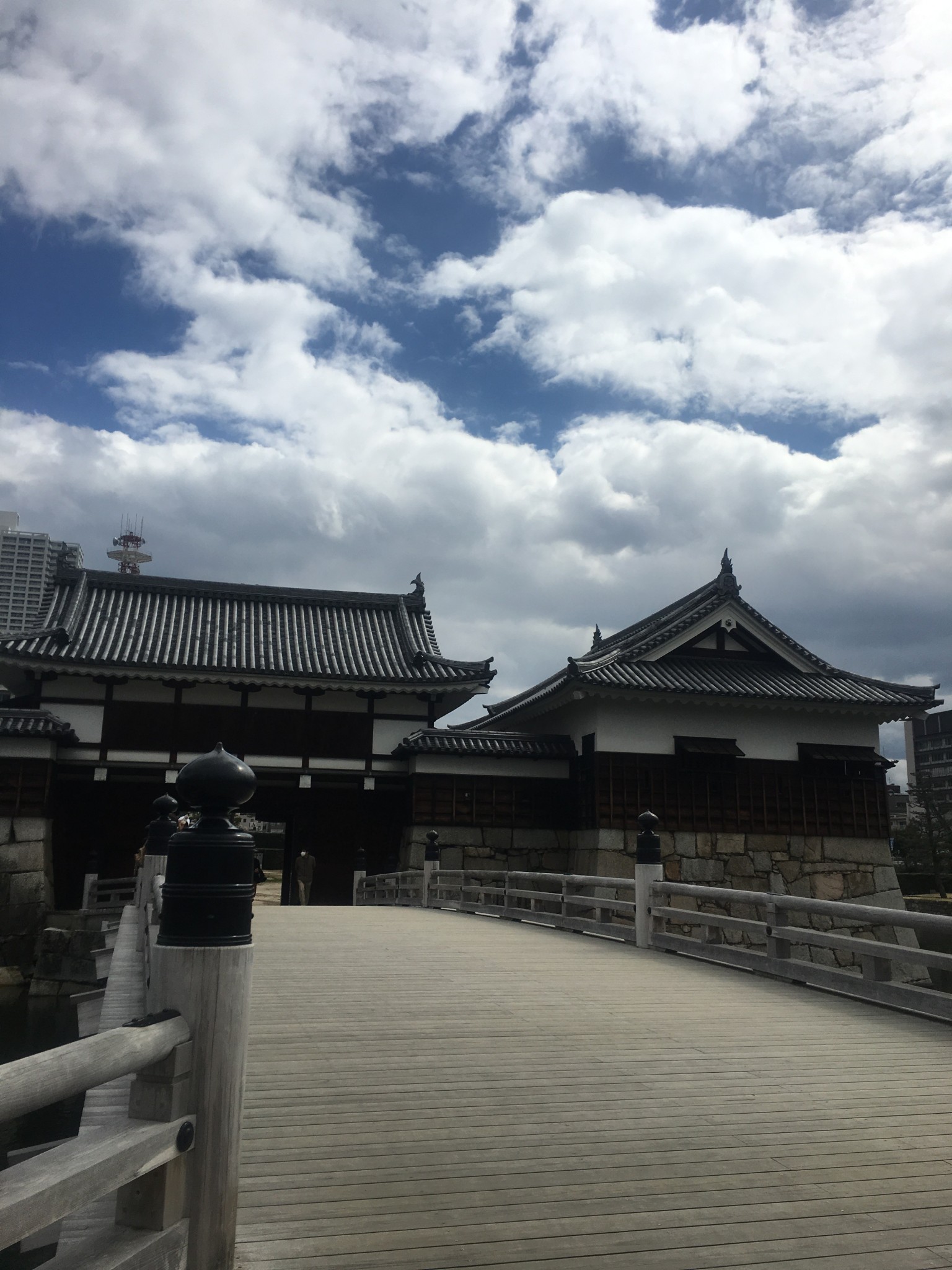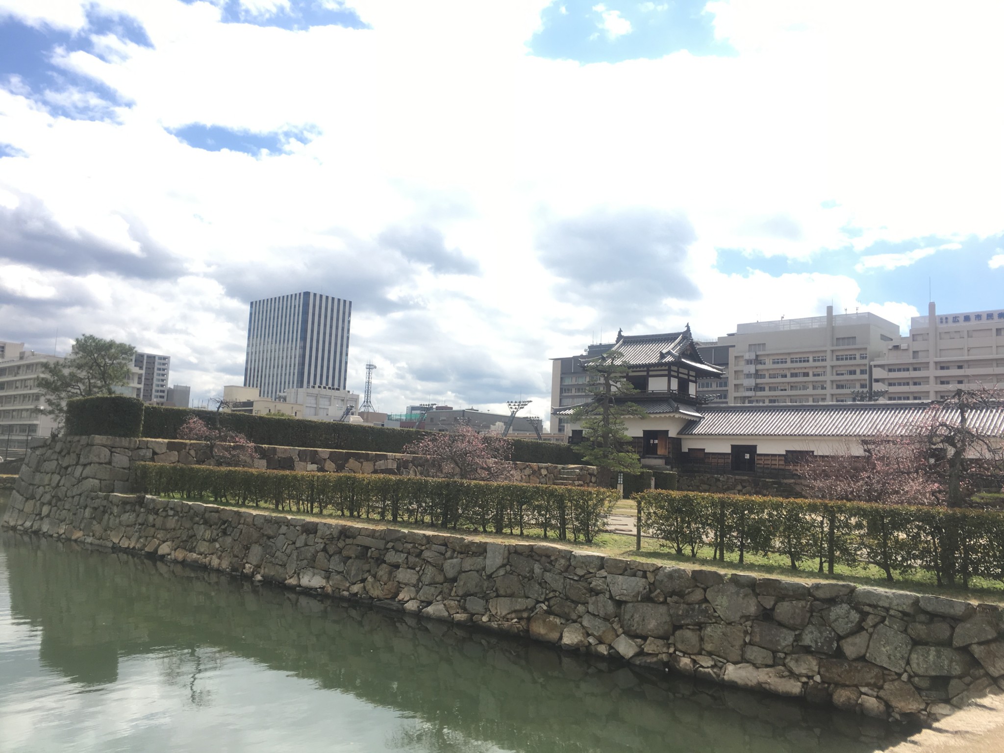 Hiroshima Castle is located in a corner of a wide garden. I saw a shrine with a horse statue just before the shrine near the entrance gate. The gate isn’t big as the one at Osaka Castle, but it has a bridge and town landscape behind it. This is something unique about Japan, keeping its history amid its modernity.