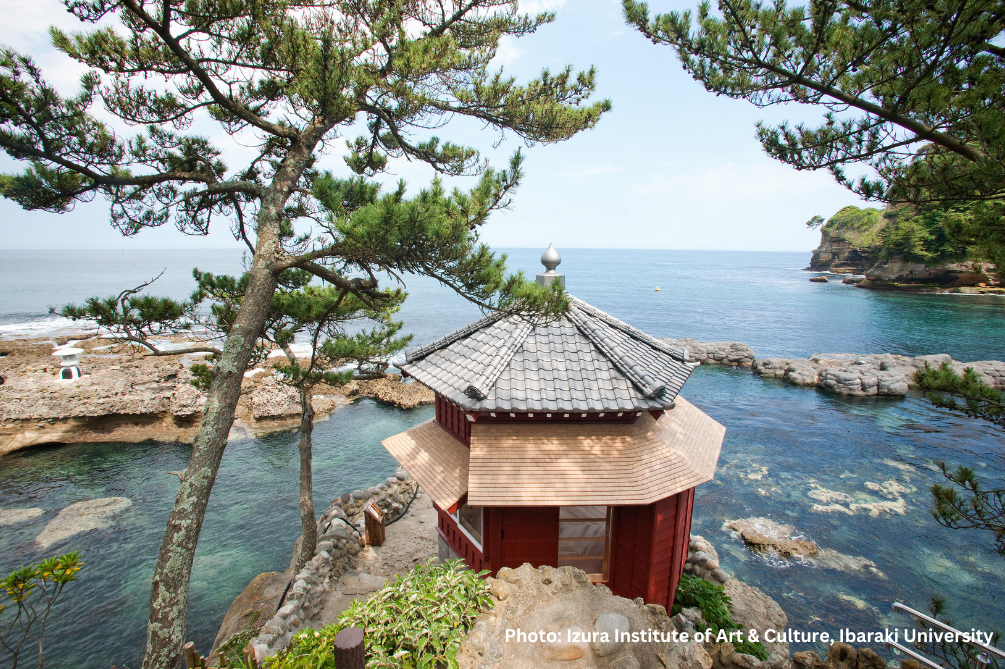 On a beautiful rocky beach on the Izura Coast overlooking the calm sea stands Rokkakudo, a small structure designed by Tenshin.