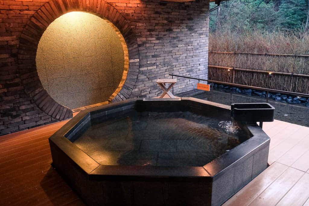The star attraction is the private onsen spa that’s literally had my name on it… for the next hour at least. With a reservation made for 4:00 pm, I arrived a bit late and hastily made my way up as soon as I checked in. There are three types available, and I booked 70 minutes in the Chinese-style “Rinsen” room. With a living room, rock sauna, bucket of sparkling wine, and a view of the garden from my bath, this is by far the most lavish onsen experience of my life. The spa even has its own genkan (Japanese entryway)! While sipping sparkling wine and listening to the soft drizzle of rain outside, I feel my busy day melting away with it.