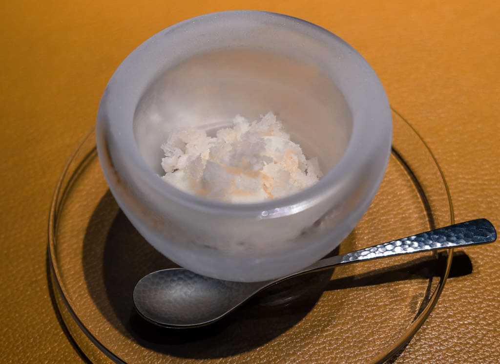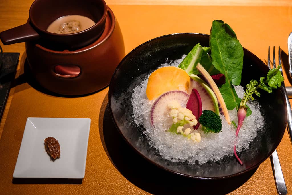 Like many of the ryokan in the area, a local kaiseki (traditional multi-course Japanese meal) is offered here at Hotel Shogetsutei’s RICCA. Kaiseki meals are one of my favourite ways to enjoy an area’s bounties, as local and seasonal foods are often a highlight of the meal. With a French and Italian-inspired menu, I order one of the set meals that included appetizers, several main dishes, dessert, and even a palette cleanser. Brought out by waiters and waitresses dressed in crisp white button-ups and black vests, the plates arrived one by one. As soon as I finished a dish, it was quickly replaced by another of Kinosaki’s specialities. Egg bisque with crab and shrimp. Hirame paté and local cured ham. Sweet turnips with anchovy sauce. Two-month aged Tajima steak. Nigori saké and strawberry sorbet.