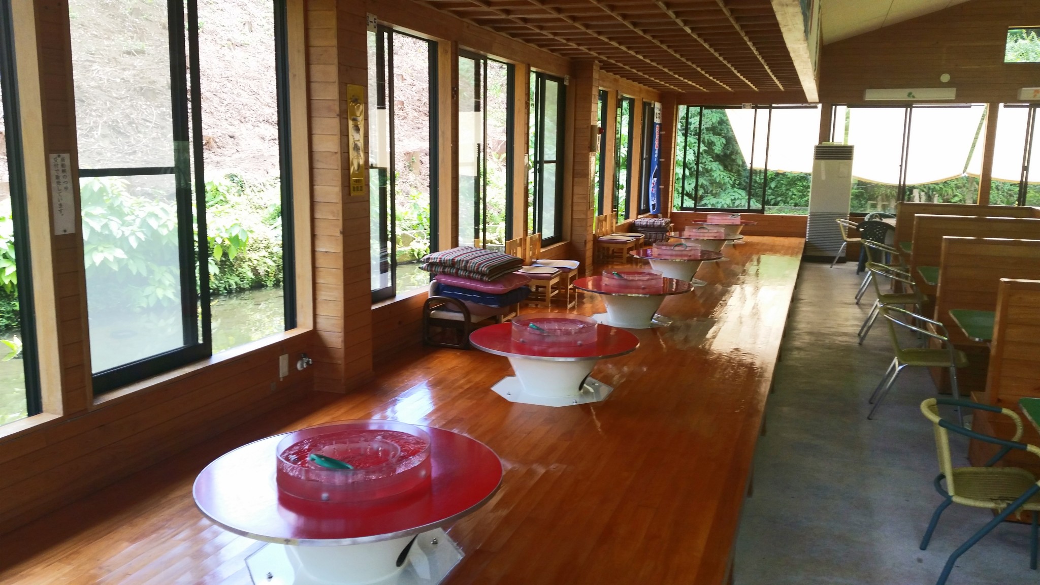 What I found was a big surprise. We ordered the teishoku meal that included somen (thin white noodles), grilled trout, trout sashimi, and other side dishes. Instead of eating noodles from a bowl or a plate, we had to catch them using chopsticks. They were spinning and racing around a whirlpool in the unique container provided for each table.