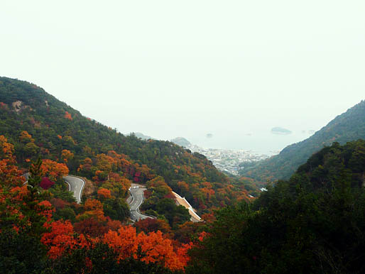 The road tended between dramatics and quiet ocean living. After a little while, I came to a sunset village of some concrete apartments looking better situated in eastern Tokyo’s residential high-rises than by the shore. Quiet as the surrounding winter forest, it was yet a dramatic set of spires set against the marine decline of the coastal mounts. No sound drifted out of the buildings, and I felt it bizarre to consider that even a small island such as Shodoshima had bedroom communities.